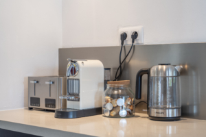 Met melkopschuimer, waterkoker etc.