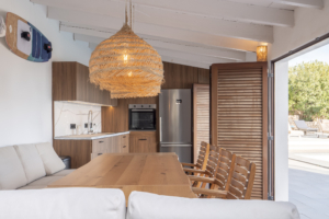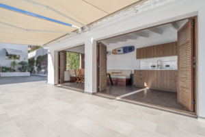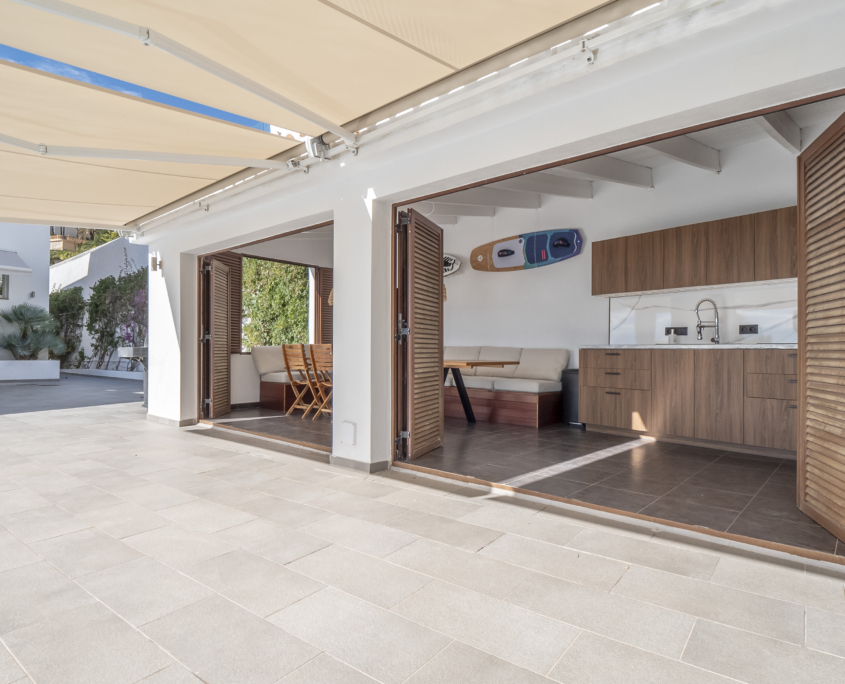Volledig overdekte buitenruimte met complete keuken, eethoek en badkamer.